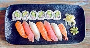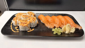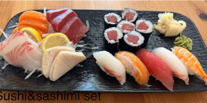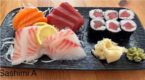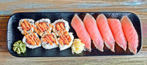 Tuna roll, 5pcs sushi, and 10pcs sashimi.