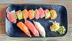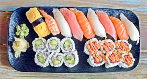 1 rainbow roll, 2 California rolls, 2 spicy tuna rolls, 1 shrimp tempura roll, 1 New York roll.