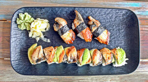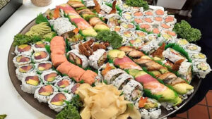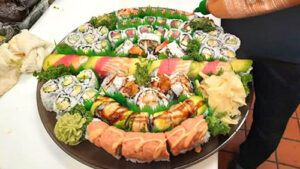1 dragon roll, 1 file fire roll, 1 shrimp tempura roll, 1 Boston roll, 2 rainbow rolls, 2 New York rolls, 2 California rolls, 2 spicy rolls.
