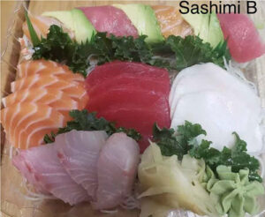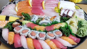35 pcs sashimi, 20 pcs sushi, 1 rainbow roll, 1 shrimp tempura roll, 1 spicy tuna roll.