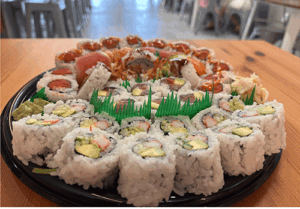 2 dragon rolls, 2 shrimp tempura rolls, 2 rainbow rolls, 1 file fire roll, 1 spider roll,  1 Alaska roll,  2 New York rolls, 2 California rolls, 2 spicy tuna rolls, 2 Boston rolls.